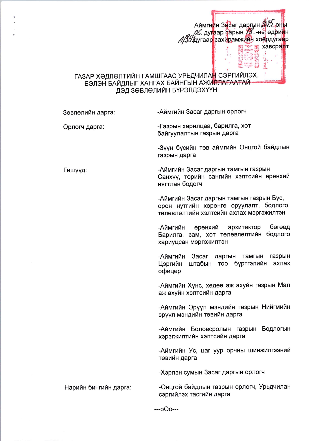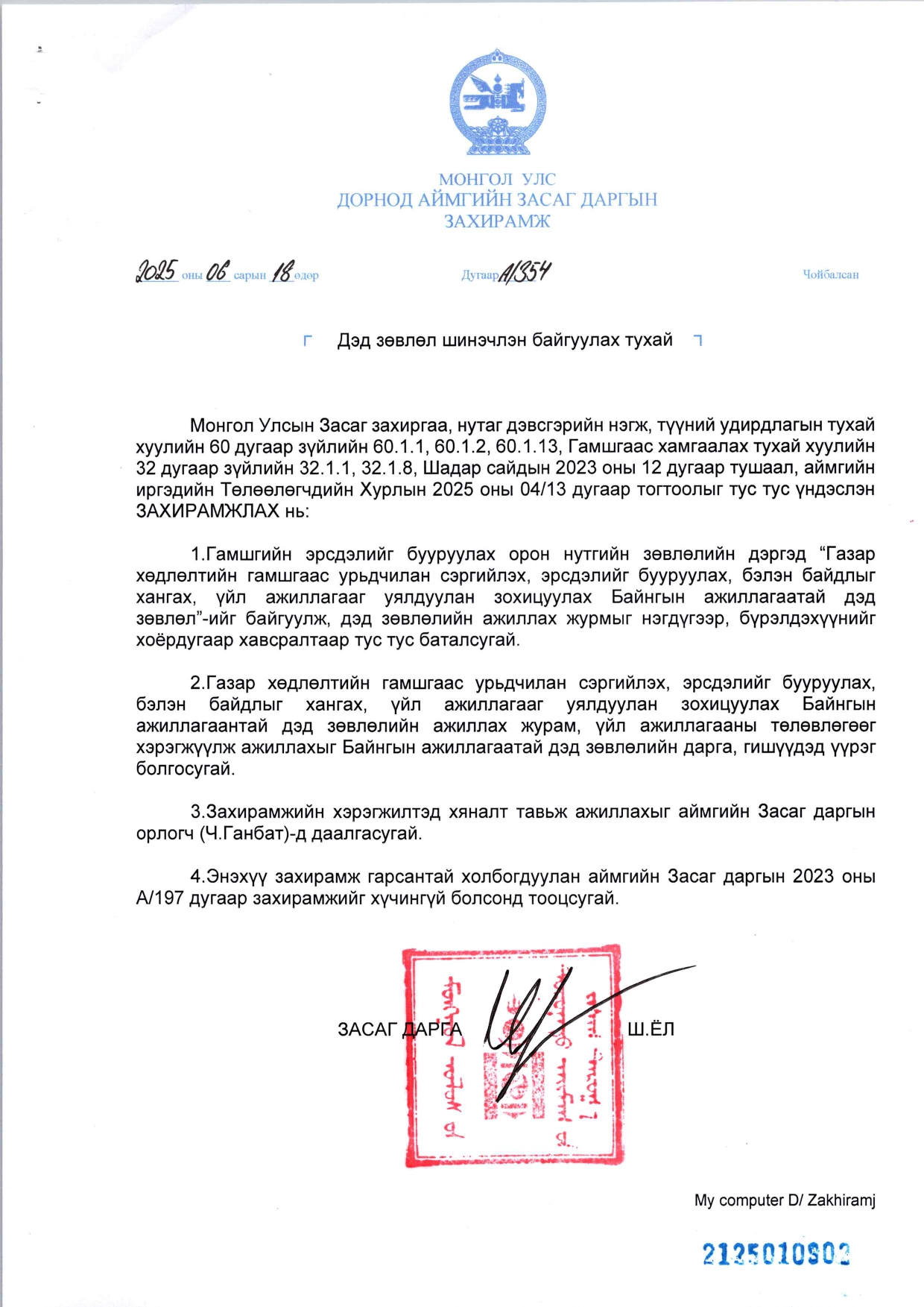 АЙМГИЙН ЗАСАГ ДАРГЫН ЗАХИРАМЖ А/354 2025.06.18 ДЭД ЗӨВЛӨЛ ШИНЭЧЛЭН БАЙГУУЛАХ ТУХАЙ